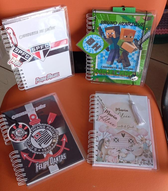 A caderneta de vacina é padronizada com parte interna miolo 10 folhas adicionais um bolso plástico um bolso de papel.
